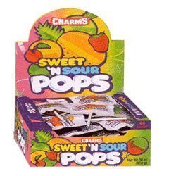 Charms Sweet And Sour Pops are delicious sweet and sour lollipops.Each split-personality pop has a sweet half and a sour half.Box contains 48 Charms Sweet & Sour Pops in assorted fruity flavors.Great for school parties or anytime. Relate Items