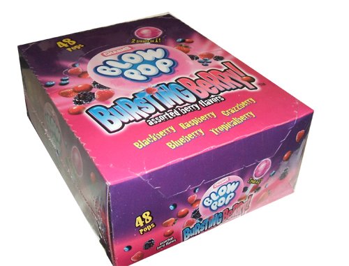 New Charms Bursting Berry Blow Pops. The bubble gum sucker. Each box of blow pops comes in an assortment of all berry flavor suckers. You will find the following assorted flavors Blackberry, Raspberry, Crazzberry, Blueberry, and Tropical Berry. Blow pops Technical Details